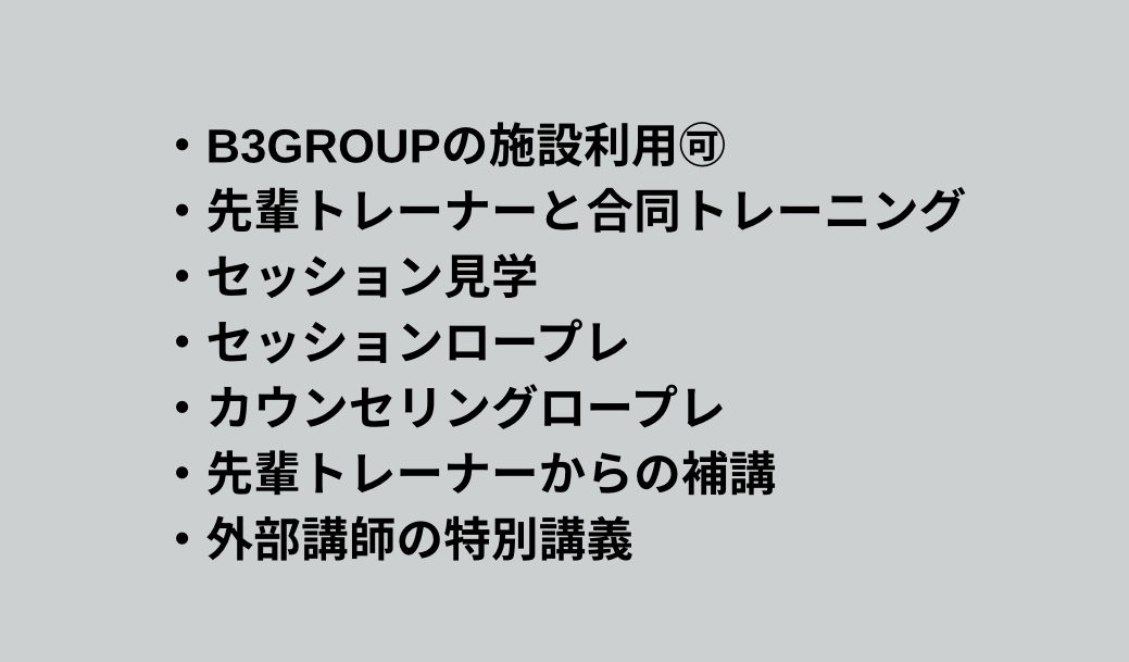 - 研修制度完備(B3ACADEMYトレーナー養成講座)